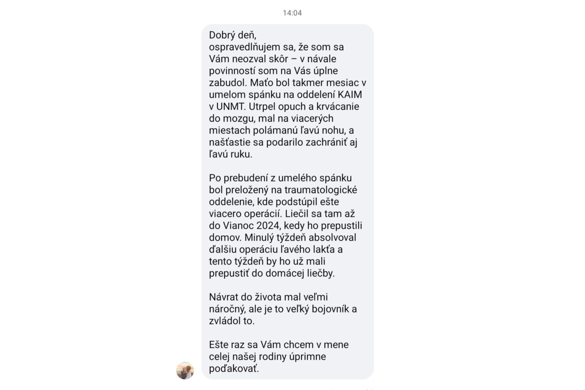 Len nedávno Martin absolvoval ďalší zákrok – operáciu ľavého lakťa. Aj keď pred ním ešte stojí rehabilitácia, jeho príbeh je silnou pripomienkou toho, že aj po veľmi ťažkých chvíľach môže prísť nový začiatok.