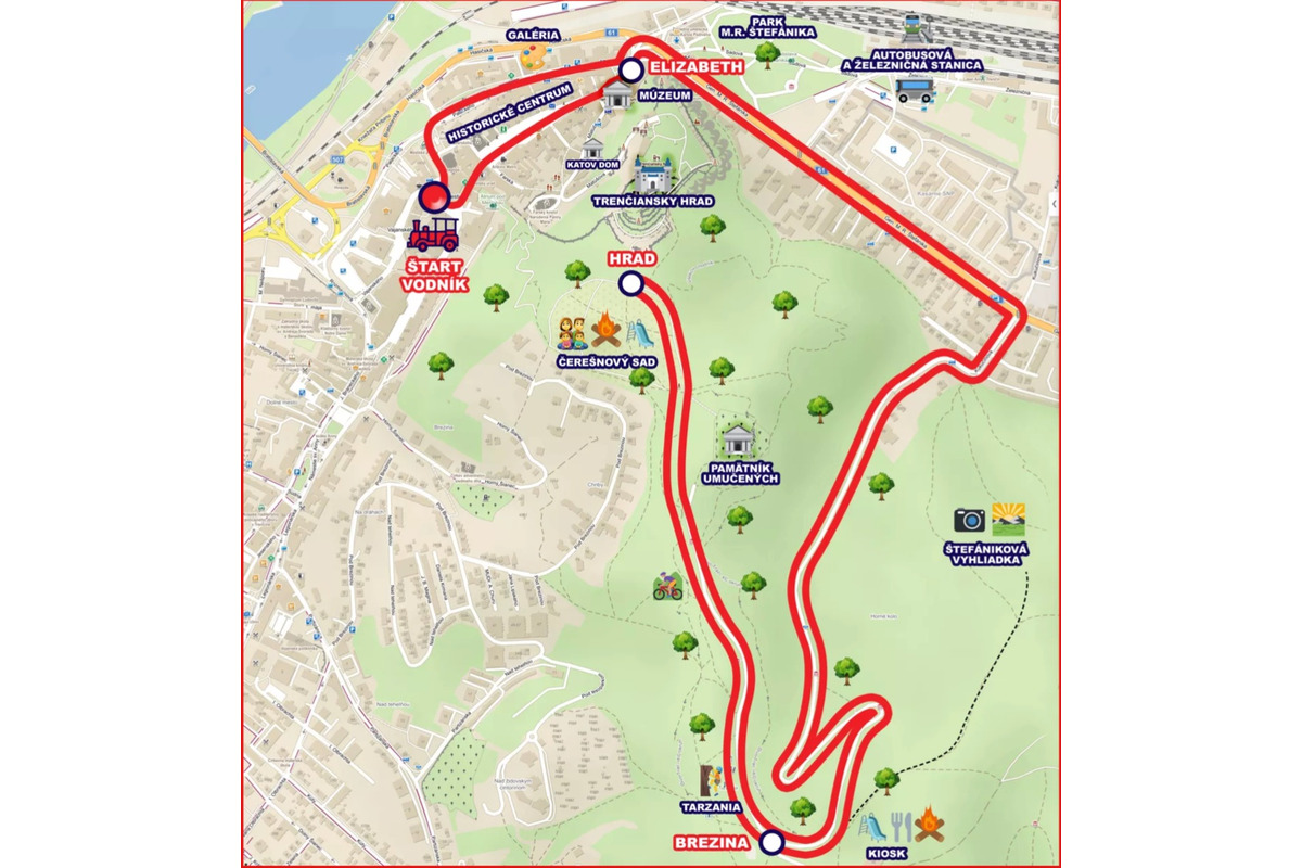 Trasa sa teda začína v centre mesta a končí až pri majestátnom Trenčianskom hrade. Záujemcov prevezie cez historické centrum a Lesoparkom Brezina. „Vďaka audio-sprievodcovi budú môcť cestujúci vláčikom spoznať pamiatky a krásy mesta Trenčín ako nikdy predtým,“ uvádzajú prevádzkovatelia vláčika na webovej stránke.