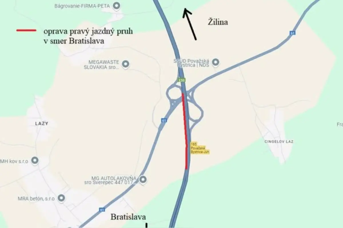 Práce budú prebiehať konkrétne v kilometroch 164,400 až 161,900 a týkajú sa pravého – takzvaného pomalého pruhu. Počas tohto obdobia dôjde k dočasnému dopravnému obmedzeniu. Premávka bude presmerovaná do ľavého jazdného pruhu, čo môže spôsobiť zníženie plynulosti dopravy a možné zdržania, najmä v dopravných špičkách. Vodičom sa preto odporúča zvýšiť opatrnosť a v prípade možnosti zvážiť aj alternatívne trasy.