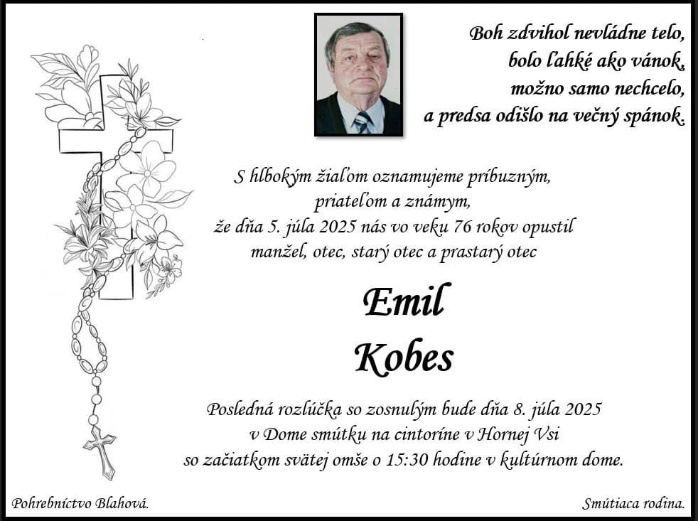 Posledná rozlúčka so zosnulým sa uskutoční v utorok 8. júla 2025 v Dome smútku na cintoríne v Hornej Vsi. Svätá omša začne o 15:30 hod. v miestnom kultúrnom dome.
