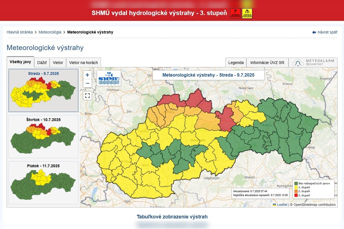 K mimoriadne výdatným zrážkam sa pridávajú aj hydrologické výstrahy. SHMÚ upozorňuje, že vzhľadom na nasýtenosť povodí a trvalý dážď môže dôjsť k vzostupu vodných hladín na tokoch, najmä v menších obciach či pri potokoch.