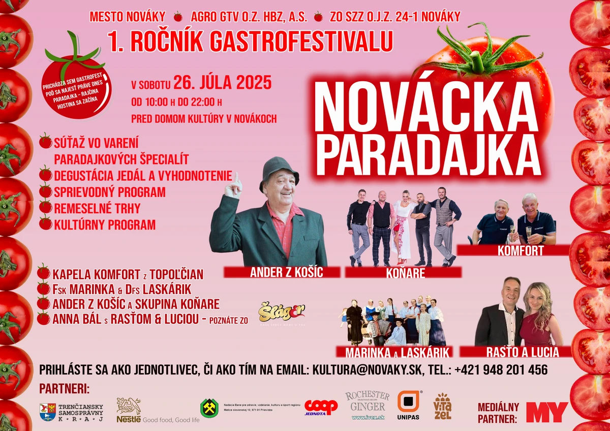 Milovníci paradajok a dobrého jedla by si mali zapísať do kalendára sobotu 26. júla. V Novákoch sa totiž uskutoční 1. ročník netradičného gastrofestivalu s názvom „Novácka paradajka“, ktorý sľubuje originálne chute, zábavu a bohatý kultúrny program.