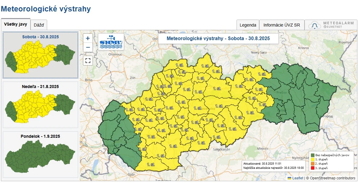 Slovenský hydrometeorologický ústav (SHMÚ) dokonca vydal na sobotu a nedeľu výstrahy 1. stupňa pred silným dažďom, ktoré platia pre Nitriansky, Trenčiansky, Banskobystrický, Prešovský, Žilinský, Trnavský a Košický kraj.