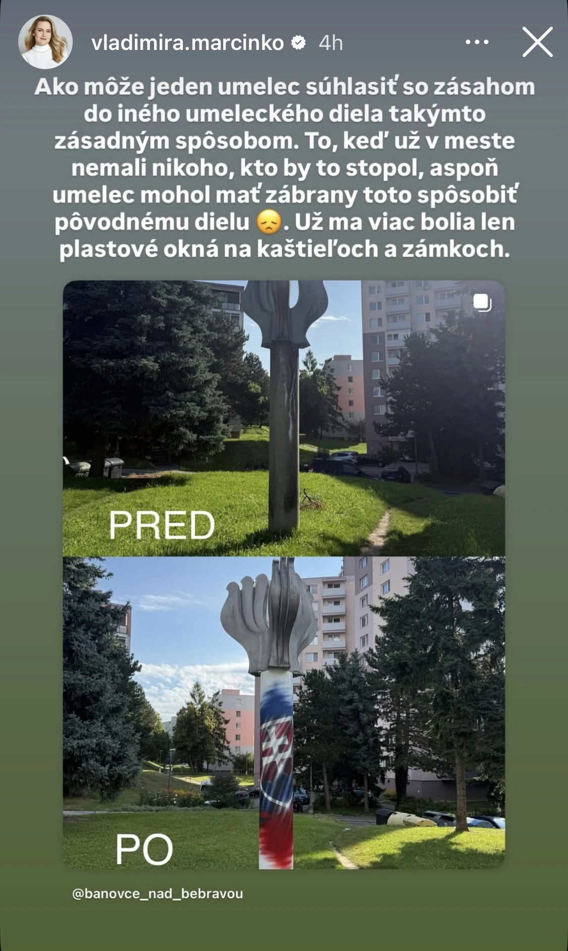 K spolupráci bánovskej samosprávy a umelca sa vyjadrila aj poslankyňa Národnej rady SR Vladimíra Marcinková. „Ako môže jeden umelec súhlasiť so zásahom do iného umeleckého diela takýmto zásadným spôsobom?“ napísala.