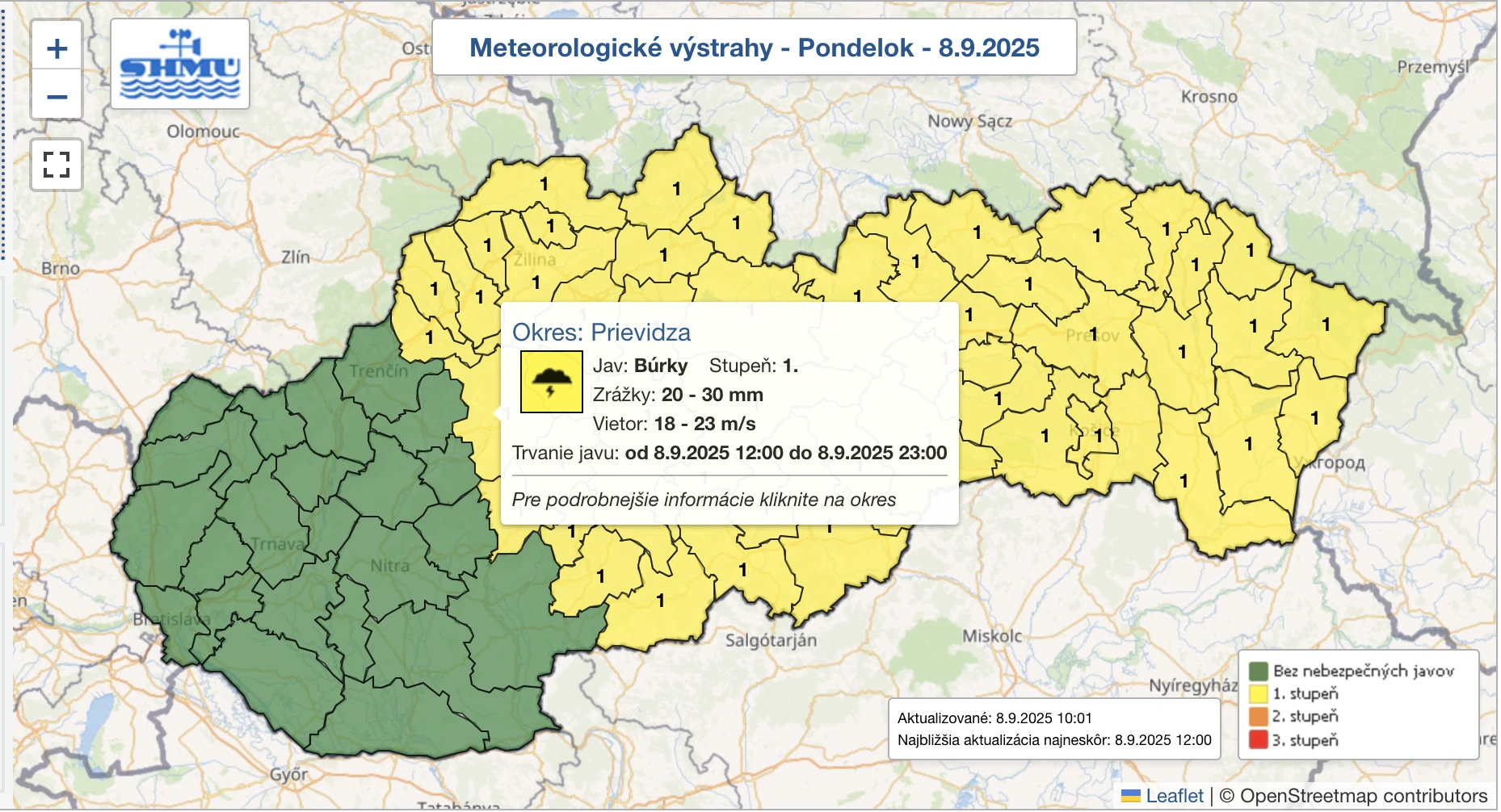 Výstraha prvého stupňa platí pre okresy Ilava, Považská Bystrica, Prievidza a Púchov. Búrky môžu spôsobiť obmedzenie bežných aktivít a ohroziť zdravie, preto meteorológovia odporúčajú obozretnosť a sledovanie aktuálnych správ o počasí.