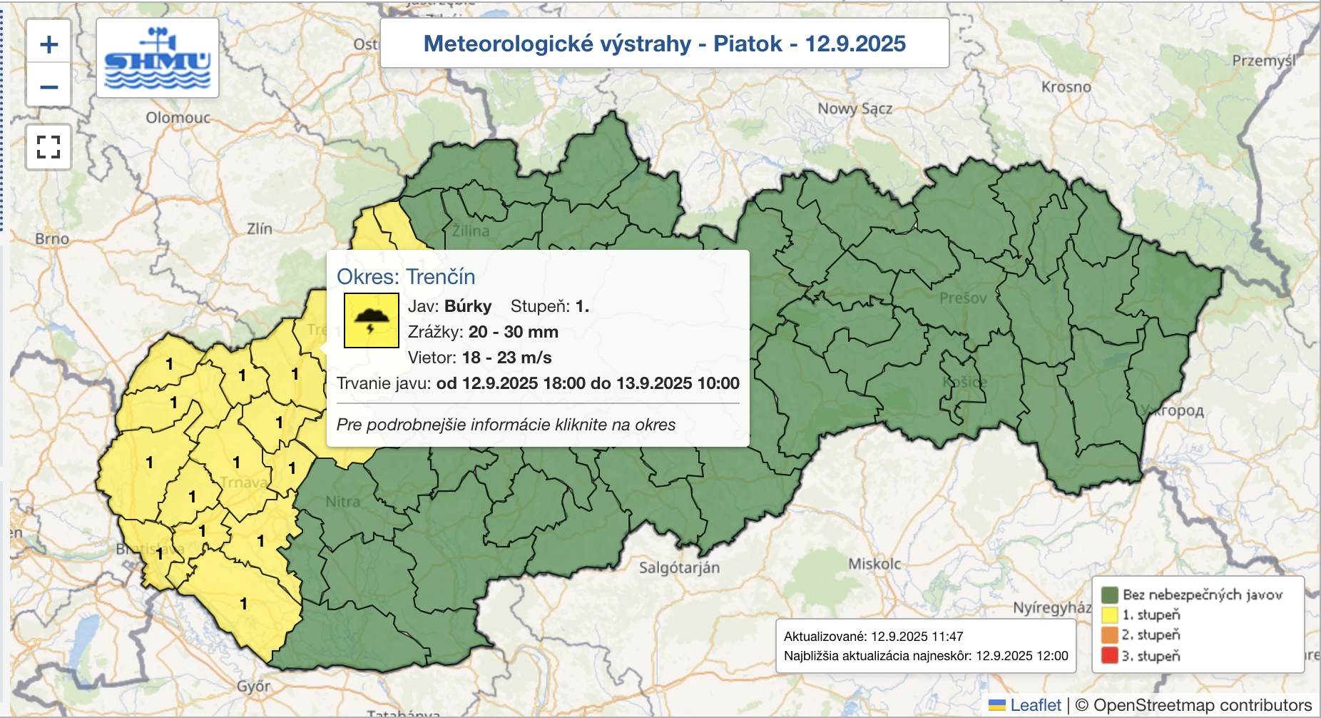 Výstrahy prvého stupňa pred búrkami platia najmä pre okresy Považský Bystrica, Púchov, Ilava, Trenčín, Bánovce nad Bebravou, Nové Mesto nad Váhom a Myjava, ktoré sa očakávajú od 18:00 do zajtra 10:00 hod.
