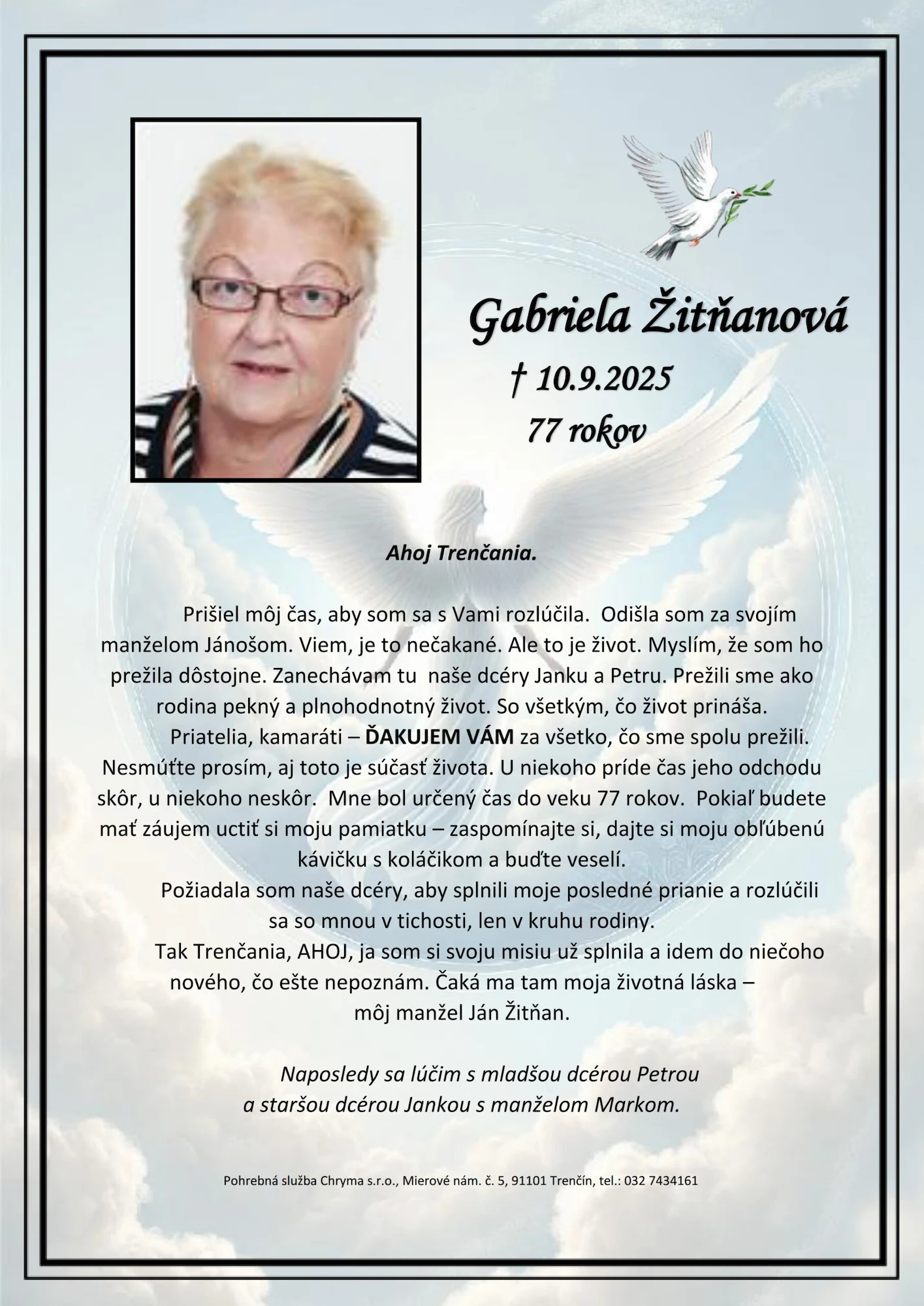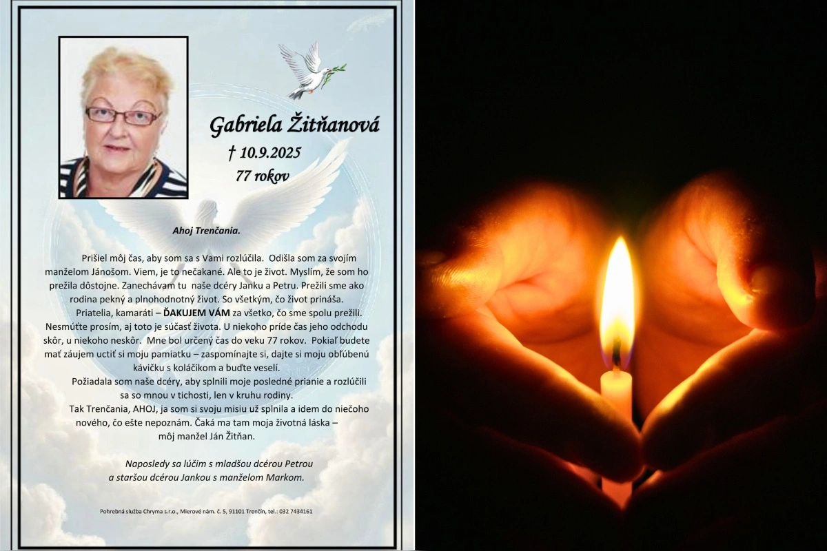 Vo veku 77 rokov zomrela Gabriela Žitňanová, vážená Trenčanka, ktorá počas svojho života bola symbolom dôstojnosti a rodinných hodnôt.