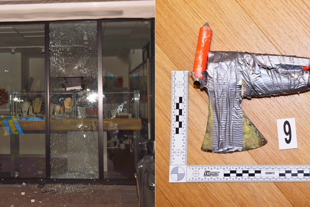 FOTO: Zlodej v Ilave rozbil výklad zlatníctva sekerou, namiesto zlata si odniesol atrapy obrúčok, ktoré cestou postrácal