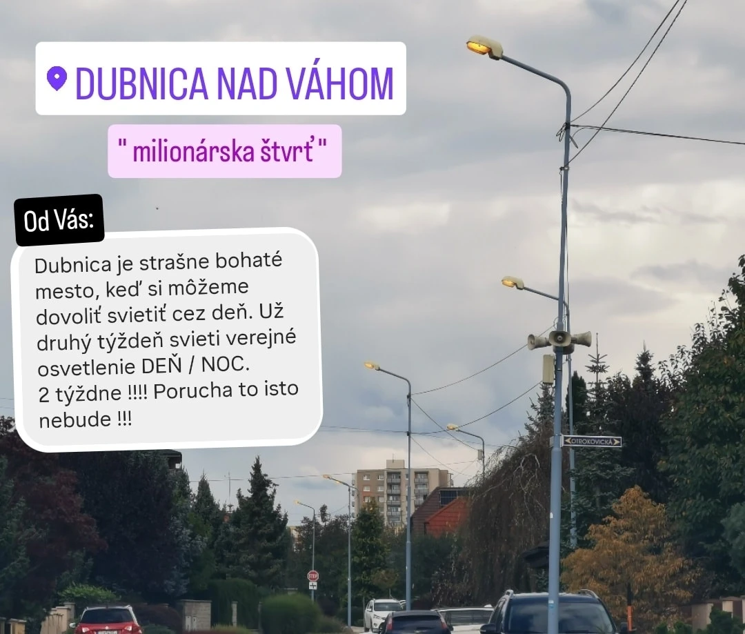 Obyvatelia Dubnice nad Váhom si posledné týždne všímajú zvláštny jav. Mestské osvetlenie podľa nich svieti nepretržite, aj počas dňa. „Dubnica je strašne bohaté mesto, keď si môžeme dovoliť svietiť cez deň. Už druhý týždeň svieti verejné osvetlenie deň aj noc. Dva týždne! Porucha to isto nebude,“ napísal autor príspevku v miestnej facebookovej skupine, ktorý tým rozvíril pozornosť viacerých Dubničanov.