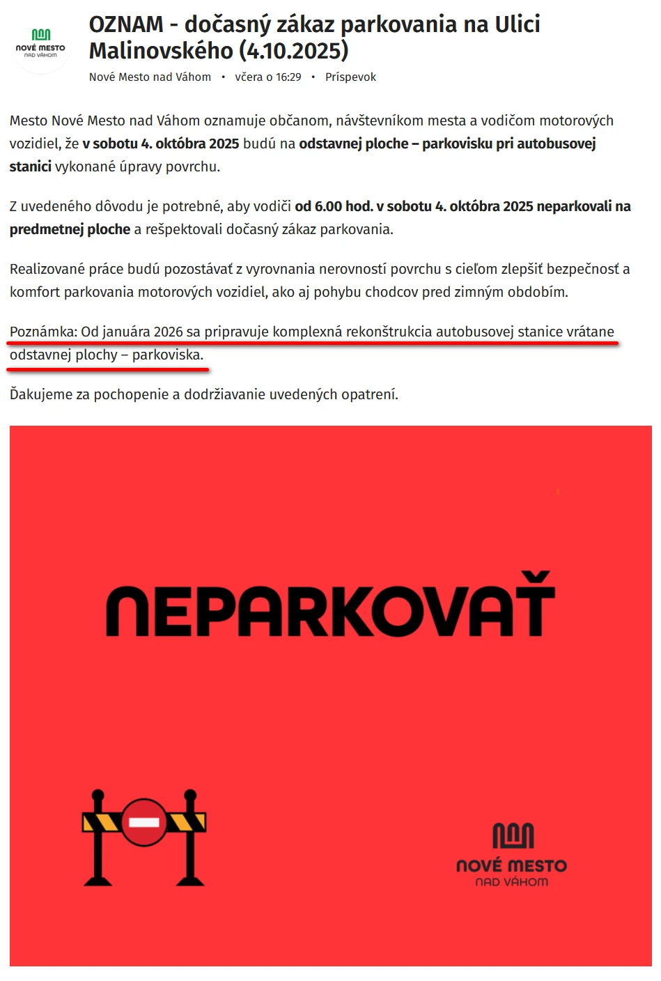 Novomešťania, pripravte sa, už túto sobotu, 4. októbra 2025, čaká motoristov nepríjemné prekvapenie. Parkovisko pri autobusovej stanici sa totiž na celý deň zmení na stavenisko.