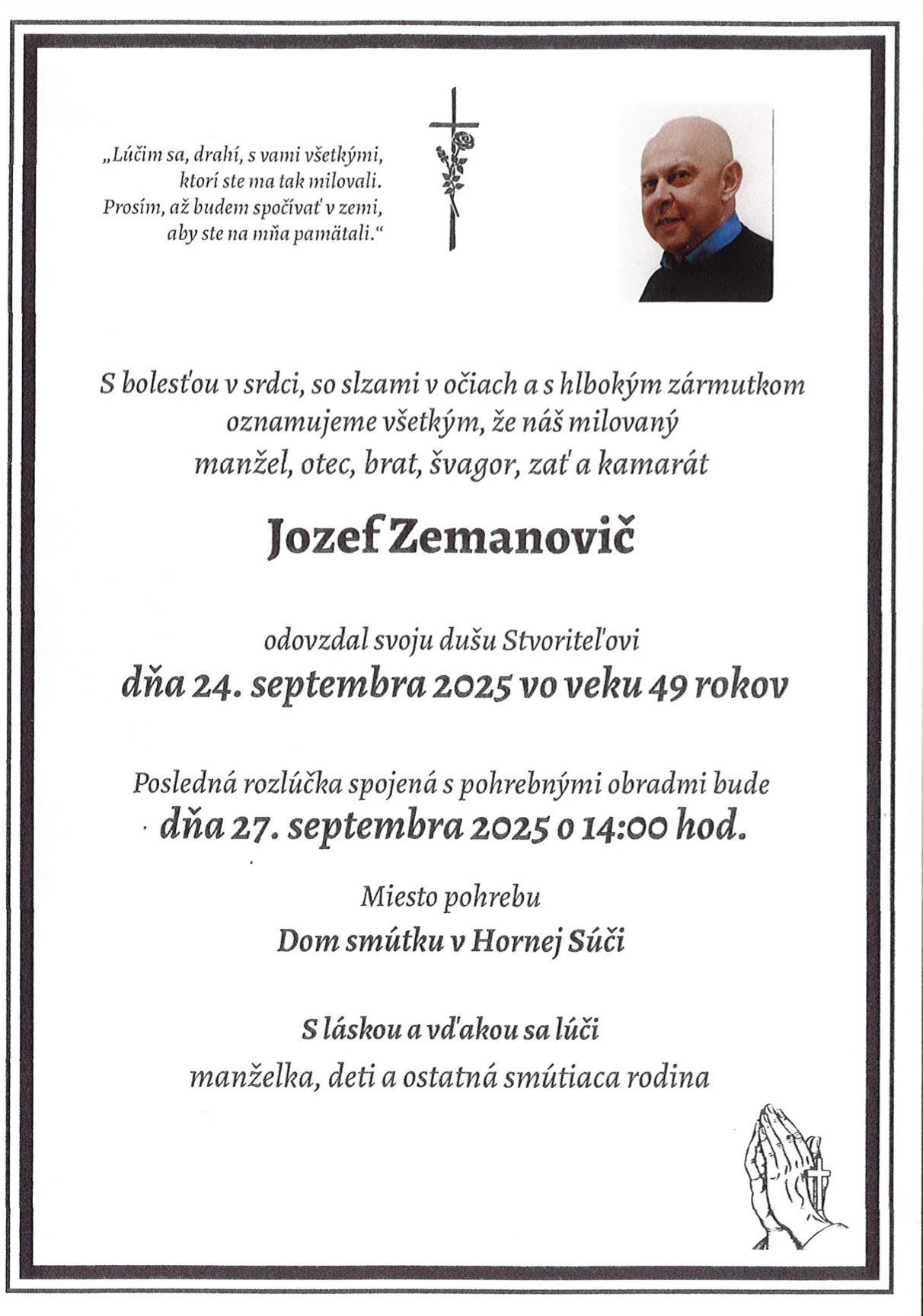 Obec Horná Súča zasiahla smutná správa. Vo veku 49 rokov zomrel dlhoročný poslanec Obecného zastupiteľstva Jozef Zemanovič.