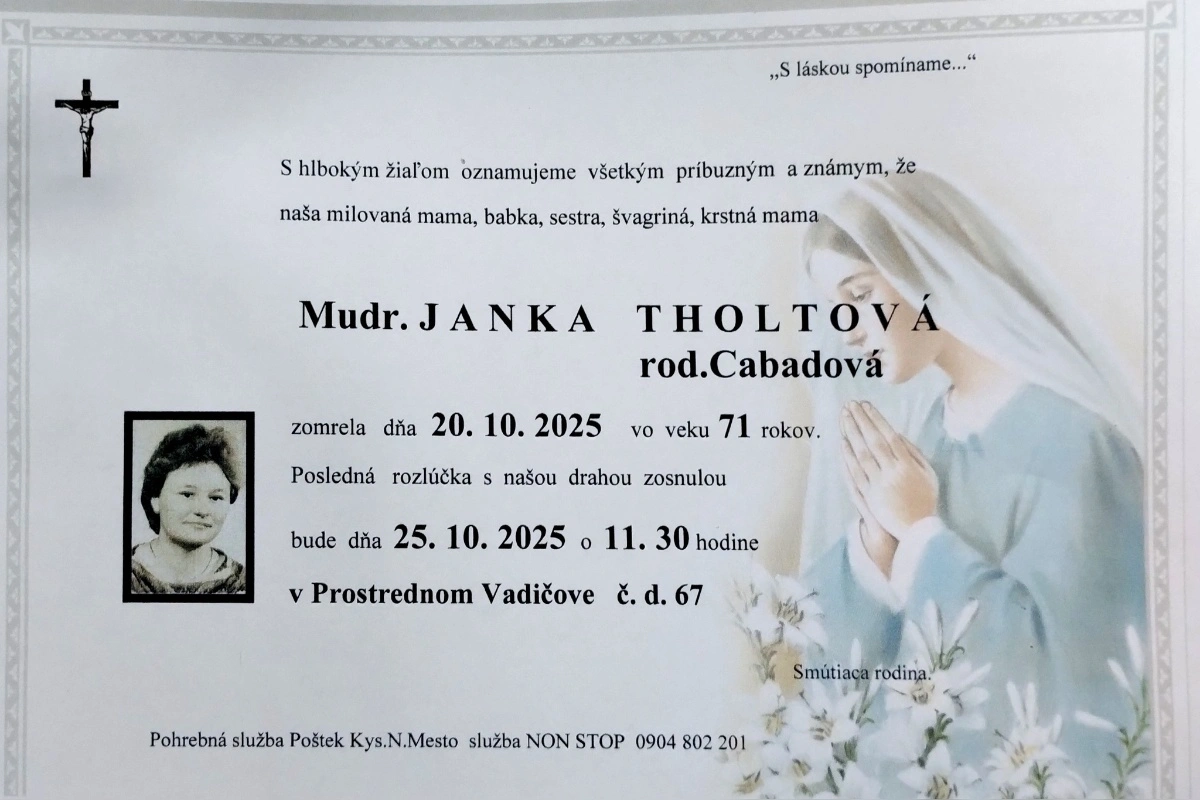 Dubnica nad Váhom prišla o významnú predstaviteľku miestneho zdravotníckeho prostredia. V nedeľu 20. októbra, vo veku 71 rokov, zomrela všeobecná lekárka MUDr. Janka Tholtová. Informujú o tom na profile verejnej skupiny Dubnica nad Váhom aktuality.