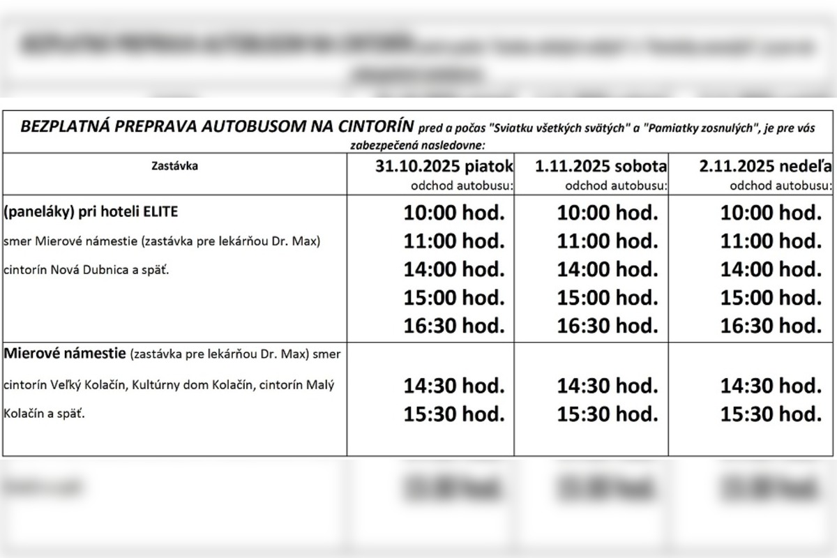 Bezplatnú dopravu na cintorín pripravilo aj mesto Nová Dubnica. Kyvadlový autobus bude premávať od piatka 31. októbra do nedele 2. novembra, teda počas celého dušičkového víkendu. Určený je najmä seniorom a zdravotne znevýhodneným obyvateľom, no využiť ho môžu všetci, ktorí sa chcú pohodlne a bezpečne dopraviť na cintorín.